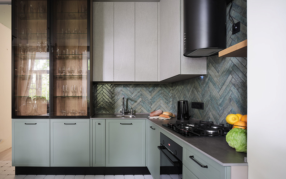 будет выглядеть готовый проект. Это лишь один из вариантов реализации, который вы сможете скорректировать под свои нужды и предпочтения. К примеру, поменять оттенок фасада или корпусов, воспользоваться другими материалами.Изучая проекты кухонь по индивидуальному заказу, вам необходимо обращать внимание на определенные элементы: