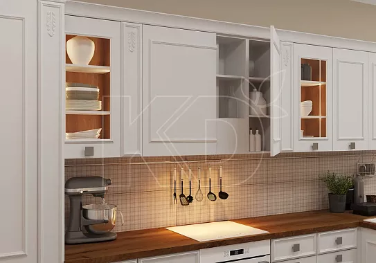 Светлые породы типа ясеня и беленого дуба в сочетании с белыми фасадами выглядят спокойно и невыразительно, но такое решение может подойти тем, кто хочет сделать стены или потолок максимально акцентными и добавить большое количество декора.
