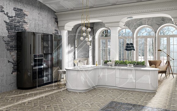 Классические комплекты тоже могут иметь скругленные углы и дверцы. В этом случае дизайн не выглядит слишком футуристично, так как волны используются в небольшом количестве, и сохраняется строгая палитра оттенков.