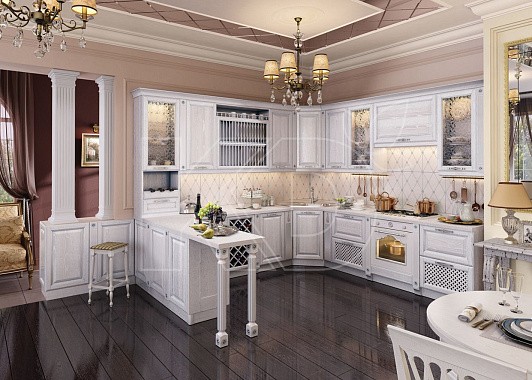 Для большого кухонного пространства подойдет П-образная планировка. В этом случае модули кухни без углов займут место возле трех смыкающихся стен.