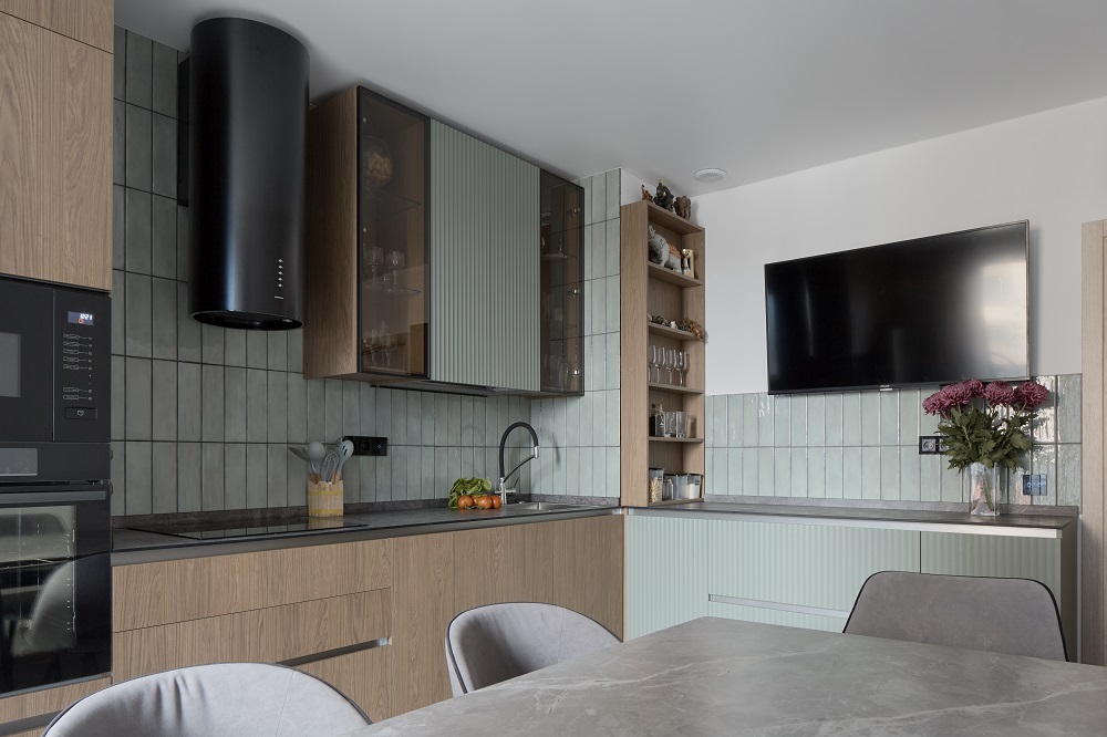 Явные отсылки к «Стоун Вуд» можно заметить, разглядывая фасады. Они выполнены из экоплиты Egger, которая искусно имитирует внешний вид и текстуру натуральной древесины и воплощает первозданную красоту природных материалов. В сочетании с оливковыми деталями кухня выглядит по-настоящему изысканно и натурально, максимально отражая основные черты экостиля. Фасады оснащены инновационной системой открывания без ручек «Space Line», делающей образ монолитным и завершенным. Это – один из реверансов модели «Стоун Вуд + Джейн Вертикаль» в сторону функциональных решений.