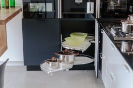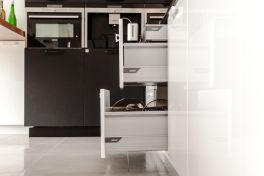 Чтобы не перегружать лишними деталями легкое и воздушное пространство кухни, гарнитур выбрали минималистичный. Как и мечтали герои, мебель расположили буквой «Г» – это отличный вариант для помещения такой конфигурации. Белые фасады почти сливаются со стенами, и на первый план выходят черные: они расположены в разных частях комнаты, а столешница – своеобразный мостик между ними. Гарнитур не выглядит строгим благодаря скругленным формам. Все шкафчики глубокие – 58 см. Корпуса сделаны из ламинированной ДСП, фасады – из МДФ, сверху нанесена эмаль, все дверцы оснащены доводчиками для бесшумного закрывания.Основная рабочая зона находится между двумя высокими шкафами для хранения продуктов и встроенной техники. В шкаф, расположенный параллельно столешнице, встроены два холодильника и выкатная колонна для сухих продуктов. Под рабочей поверхностью – посудомоечная машина, сушилка для посуды и эргономичные выдвижные ящики для хранения столовых приборов и тарелок разного размера. Они оснащены удобными металлическими и деревянными держателями.Белый шкаф, расположенный ближе к окну, открывается с торца и состоит из ящика для мелочей и выкатного ящика для бутылок. Над ними – полка с открытыми нишами, где можно, например, хранить мобильные устройства и подзаряжать их. За черными распашными дверцами верхнего яруса скрываются полки для посуды, а центральные пеналы безраздельно принадлежат современной бытовой технике. «Мертвая» зона в углу кухни тоже задействована – ящики с выдвижной арматурой превращают ее в полезное пространство для хранения. Столешница с литой интегрированной мойкой выполнена из ударопрочного и устойчивого к загрязнениям кварцевого камня с добавлением синтетических материалов и солей серебра. Ионы серебра обеспечивают антибактериальную защиту поверхности, специальные ингредиенты – износостойкость, а натуральный кварц – естественную красоту.