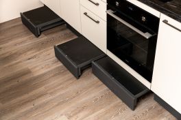 Проект полон эксклюзивных решений. Самое заметное – разноуровневые рабочие зоны, каждая из которых имеет столешницу из искусственного камня и собственную мойку. Зона с невысокими элементами разработана специально для Данилы: здесь есть компактные ящики и СВЧ-печь на комфортной высоте. А в цоколе полноразмерной зоны установлены уникальные выдвижные ступеньки. С их помощью хозяин кухни может свободно пользоваться всеми ящиками нижнего уровня, а остальные домашние – легко доставать до верхнего яруса!